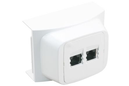 Printplaat met 2 stuks RJ45-jacks en gereedschapsloze pivotaansluitcontacten. Bestaat uit montageplaat, printplaat, kap, afdekplaat met stofkapjes en bevestigingsmateriaal.