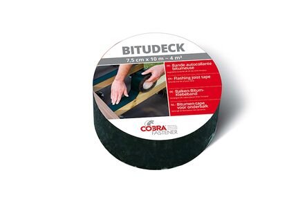 BITUDECk is een bitumen tape die je inzet als waterdichtingsband. Het is samengesteld uit een dikke laag bitumen en bedekt met een matzwarte ondoorzichte film in HDPE. Een rol bevat 10 strekkende meter en is voldoende voor ongeveer 4 m2 terras.