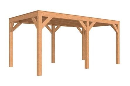 Staanders geschaafd 14×14 cmRingbalk 5,8×190 cmGordingen 4,5×14,5 cmSchoren 4,5×14,5 cmDakbeschot 1,6×11,6 cm met een vellingkantDaklatten 1,8×7 cmBevestigingsmateriaal en opbouwhandleidingDakbedekking: EPDM-rubberfolie incl. lijmMet zijwaterafvoer (stadsuitloop)
