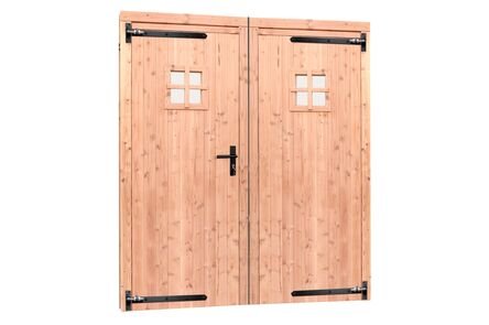 Deze Douglas dubbele deur is inclusief beslag en is vervaardigd uit PEFC gecertificeerd hout. De dubbele deur is voorzien van enkel glas.