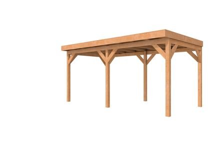 Staanders geschaafd 12×12 cm.Ringbalk 4,5×16 cm.Gordingen en schoren 4,5×12 cm.Dakbeschot 1,6×11,6 cm met een vellingkantBoeidelen 2,8×19,5 cm.Windveren 1,8×7 cm.Bevestingsmateriaal en opbouwhandleiding.Dakbedekking: EPDM-rubberfolie met zijwaterafvoer.