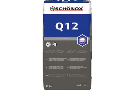Sterk stofgereduceerde, uitermate flexibele speciale poederlijm Hydraulisch verhardende, uitermate flexibele, verbruiks- en verwerkingsgeoptimaliseerde poederlijm. Speciaal geschikt voor het verlijmen op “jonge” cementdekvloeren. SCHÖNOX Q12 onderscheidt zich door zeer goede verwerkingseigenschappen, uitermate flexibel en vervormbaar. SCHÖNOX Q12 werkt ontkoppelend, vermindert spanningen en is bij vele toepassingen zonder grondering geschikt. Ideaal voor grootformaat porcellanato grès.