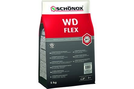 Verwerkingsvriendelijke, waterafwijzende en flexibele cementvoegmortel voor smalle voegen volgens DIN 18 352. Voor het voegen van aardewerk e.d. met zuigende scherf. Voor binnen en buiten, voor wand en vloer. Toepassingsgebied SCHÖNOX WD FLEX is geschikt voor het voegen van: aardewerkporcellanato met een wateropname van > 3 %niet verkleuringsgevoelige natuursteensoorten Mengverhouding Voor 5,0 kg SCHÖNOX WD FLEX ca. 1,3 – 1,4 l water Technische gegevens Pottijd: ca. 2 uur bij +20 °CBegaanbaar: na ca. 12 uurVol belastbaar na ca. 7 dagenVerwerkingstemperatuur: niet onder +5 °CVoegbreedte 1 tot 6 mm Materiaalverbruik: 0,3 tot 0,8 kg/m² afhankelijk van tegel- en voegformaatTemperatuurbestendigheid: -20 °C tot +80 °C