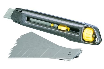 Het Stanley Interlock 18 mm mes heeft een gepatenteerde vergendeling voor het reservemes binnenin het mes. De gegoten metalen behuizing is bestand tegen oplosmiddelen. Geen gereedschap nodig bij het verwisselen van het reservemes.