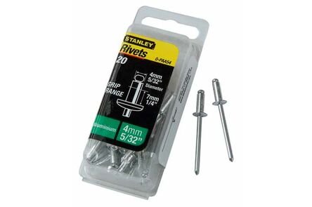 Voor het aan elkaar verbinden van plaatmateriaal. Als vuistregel geldt dat de Stanley popnagel anderhalf keer zo lang moet zijn als de gecombineerde dikte van de materialen samen.