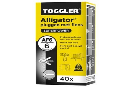 De Toggler Alligator plug met flens AF6 gebruik je voor het bevestigen van voorwerpen aan holle wanden, plafonds en massieve muren, zoals gipsplaat met tegel of cellenbeton. Met de Alligator® heb je in alle situaties maximale grip. Door de kaken bijt de plug zich muurvast. Zo monteer je de voorwerpen veilig en solide.