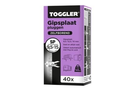 De Toggler Gipsplaatplug SP gebruik je voor het bevestigen van voorwerpen in holle wanden van gipsplaat van bijvoorbeeld 9,5 of 12,5 mm dik. Ook wanneer er IJzerwaren achter de wand zit. Monteer de plug snel en makkelijk met behulp van de zelfborende punt. Voorboren is dus niet nodig. Door de anti-rotatie stop draait de plug niet verder dan de gipsplaat. De plug past altijd als de ruimte achter de wand minimaal 33 mm is. De gipswokkel zekert automatisch achter de plaat bij het indraaien van de schroef en zorgt voor een sterke houvast.